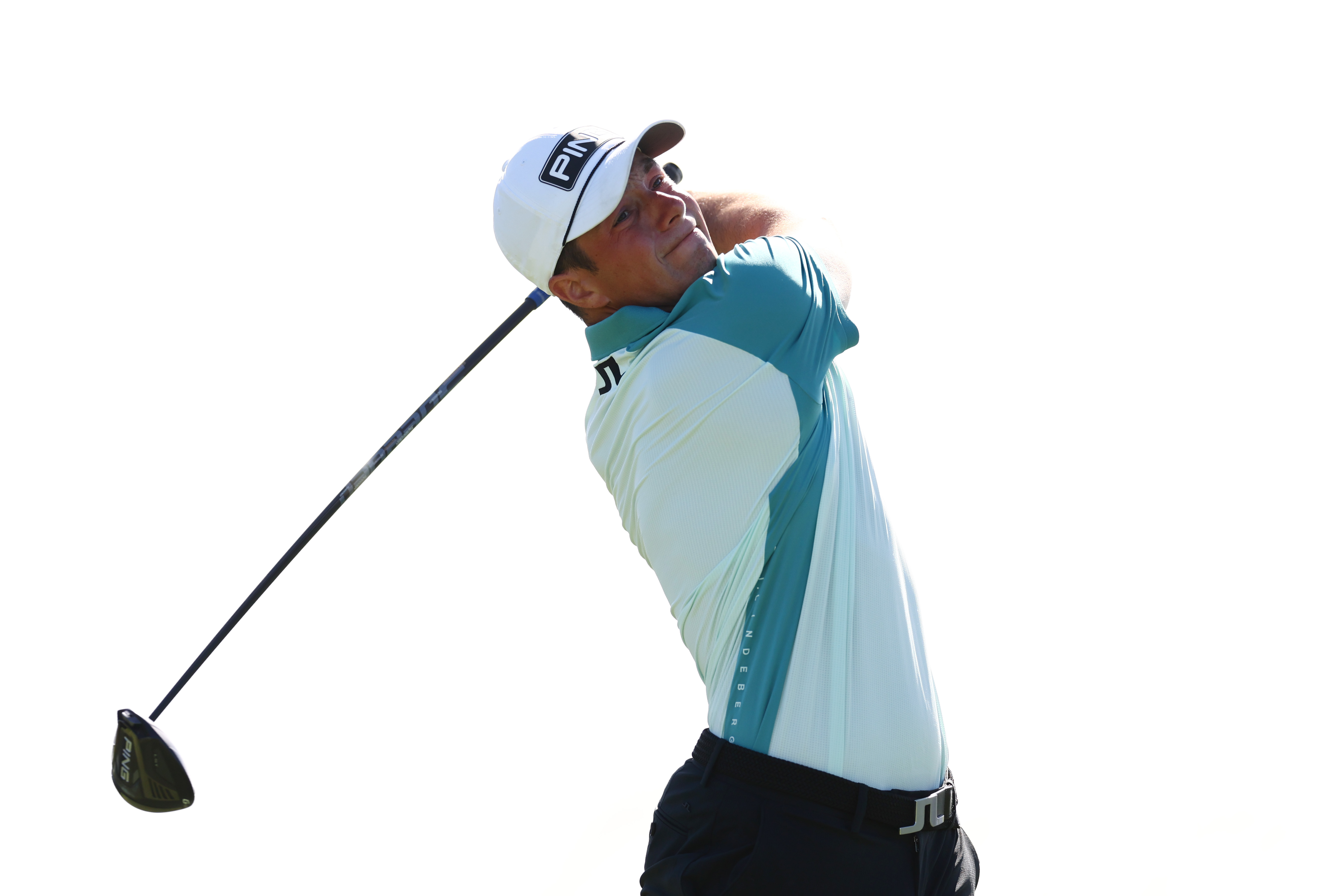 Løser dagens siste slag fra tee på utsøkt vis. Banker ballen ut i fairway og har 300 yards til flagget.
